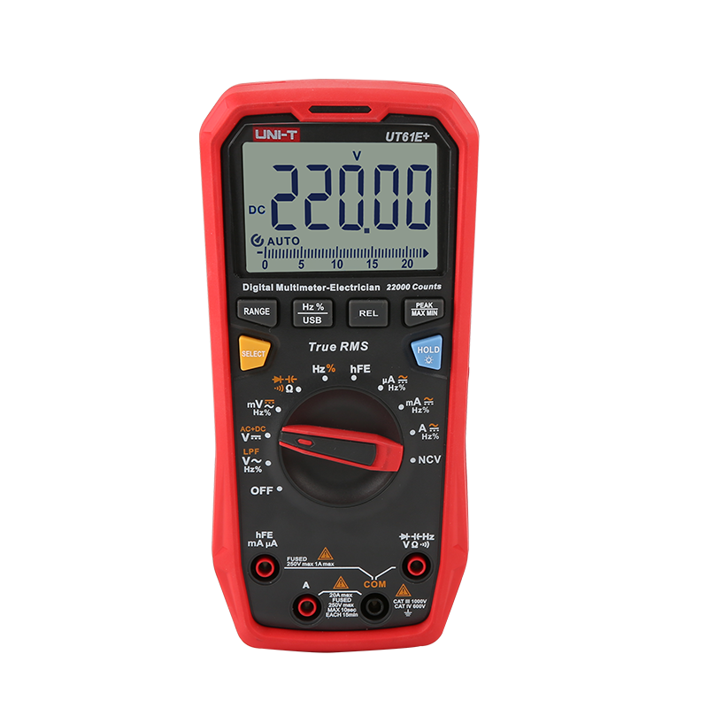 UNI-T优利德UT61+系列数字万用表UT61B+ UT61E+ UT61E+是一款性能稳定、高可靠性手持式真有效值数字万用表, 可用来测量:交直流电压、交直流电流、电阻、电容、频率、占空比、二极管、三极管及电路通断,并配备专业NCV测量功能,能够迅速准确地区分零火线,另外,全系列还具有声光提示和大电流测量高温声光报警功能,及USB通信模块自动感应开启功能,让你更直观快速地获取测试结果和更加安全测量。配备背光功能,能在紧急停电的情况下还能连续使用。 全系列外壳采用双色工艺,外观时尚,结实耐用,是用户理想的测量工具。