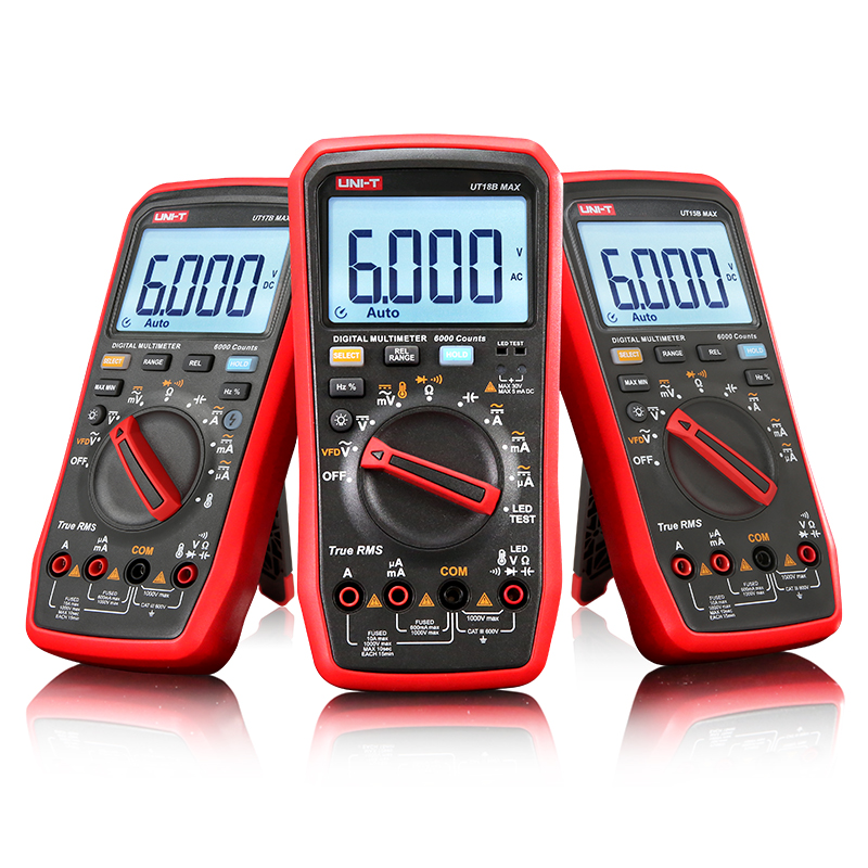 UT15B MAX/UT17B MAX/UT18B MAX 是高可靠性真有效值(True RMS)数字万用表,产品内置VFD抗干扰启动 模式,能过滤正弦波叠加的载频干扰或各种畸变电压信号,稳定测量变频器的输出电压。可在DC/AC功能下切换 进入频率及占空比测量。UT17B MAX/UT18B MAX配置了0.1°C分率温度测量功能。UT18B MAX拥有的LED测量功能最 高可测12V LED,且不用区分正负极性。该系列产品全功能实现高达30kVA能量的误测保护、电流档误插输入孔 报警,确保用户操作上更安全更放心; 产品根据CAT III 600V安全等级取得CE、cETLus认证。