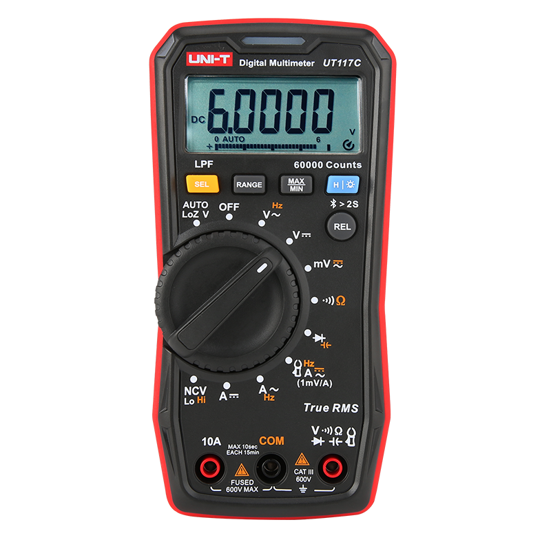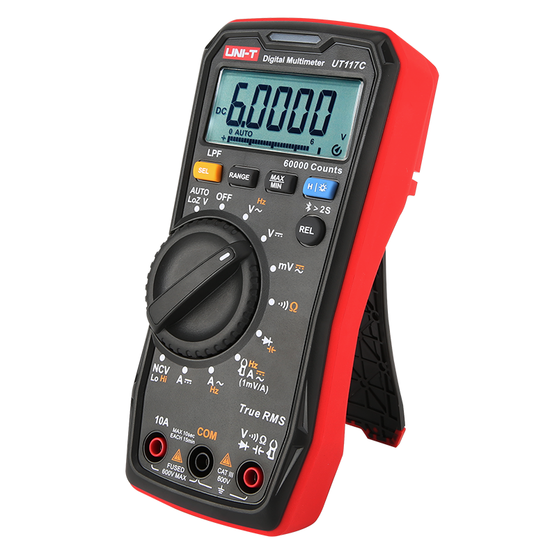 UT117C是一款具备高可靠性和高安全性的手持式60000位万用表。本仪表采用高解析度的A/D转换器及微控制器数据处理技术,具有LCD屏幕数字显示,全量程过载保护和独特的外观设计,使之成为性能更优越使用更安全的电工仪表。本仪表具有智能化、高精度、高性能、多功能之特点,能完成测量:交直流电压/流电,交流电压及电流频率,低通滤波(LPF)、导通性电阻二极管电容,外接电流探头, NCV,AUTO-VLOZ交直流电压知自动识别。并配备无线蓝牙通信功能,通过优利德智测APP记录和报告测试结果。 应用领域:家用电器安装和检修、通讯维护、汽车故障检修、电子设备检修、工业工程、科研教学、机械设备维护等领域。