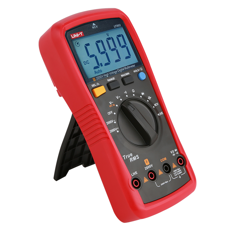 UT892是一款高压测量、真有效值、大屏显示手自一体的万用表;高压检测AC/DC电压可达2000V,同时解决VFC变频电压/频率的测量,能过滤正弦波叠加的载频干扰或各种畸变电压信号,并稳定测量输出电压。具有测量过压、过流报警提示,符合安规CATII 1000V/CATⅢ 600V 要求, 是电子电工高压设备检测优先选择的数字万用表。 广泛应用于:冶炼、通讯、制造、石油、国防、电力、光伏机站等领域。是电力设备检测、维护和维修专用测量工具,更多地解决:煤矿,光伏安装及验收高压检测。